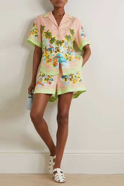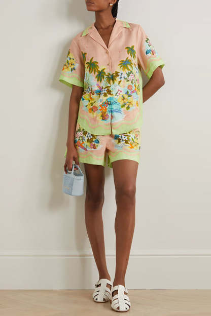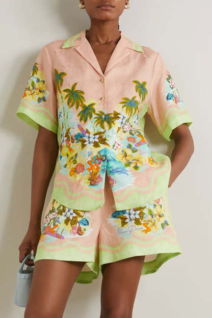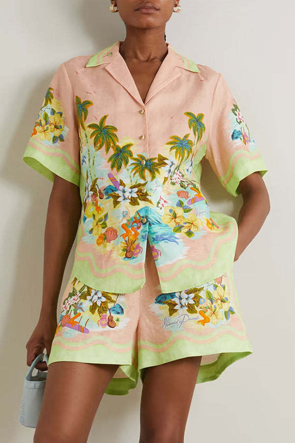Coconut Scenery Linen Blend Tropical Print Blouse and Elastic Waist Pocketed Shorts Set