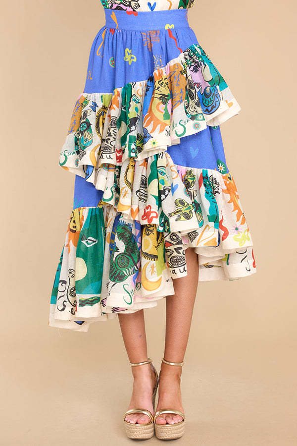 Sandy Sunshine Unique Print Irregular Ruffles Tiered Midi Skirt